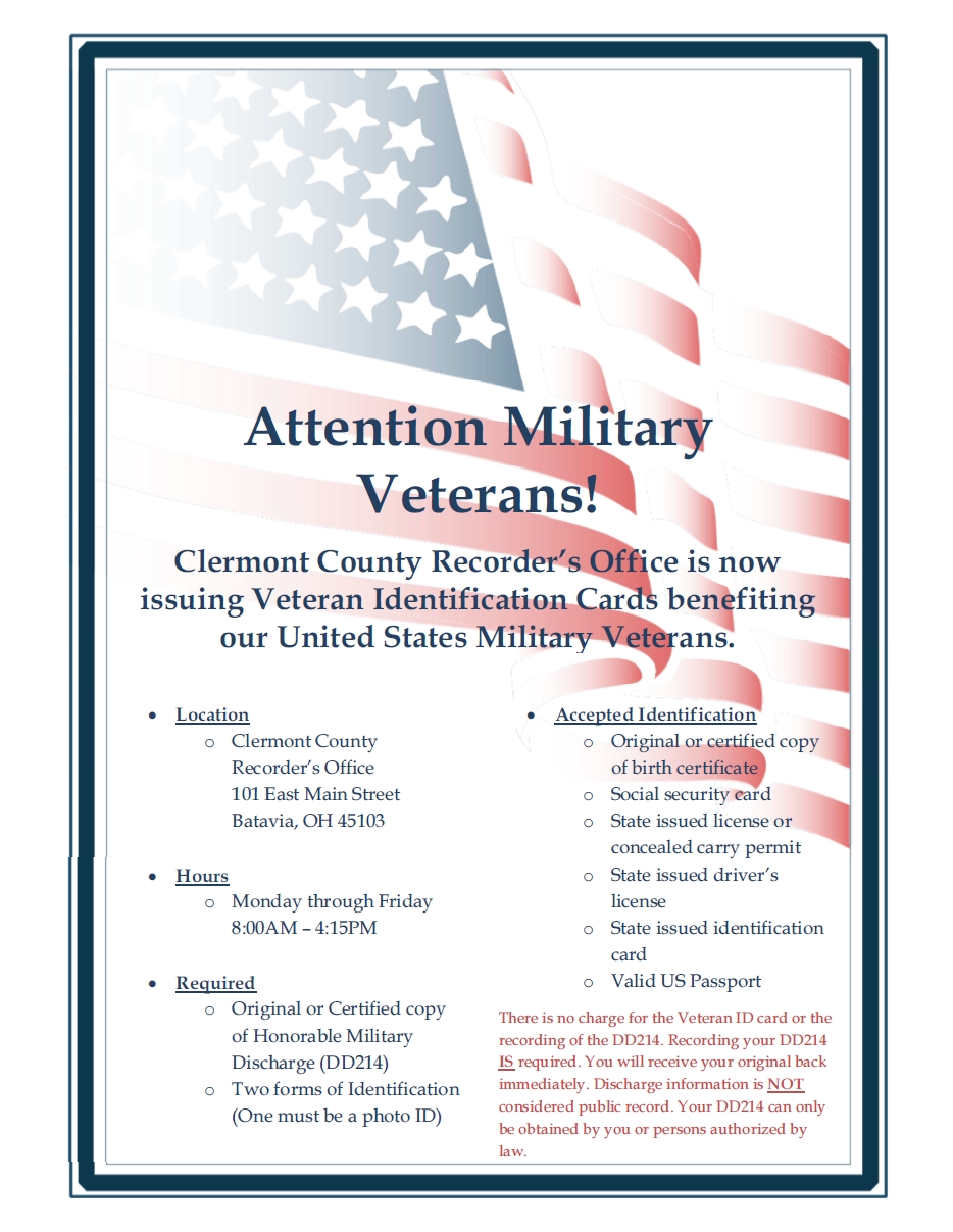 Section 317.24 of the Ohio Revised Code states, that discharge papers for veterans (DD214’s) can be recorded in the Recorder’s Office, at no cost to the veteran. The record will be copied and indexed with the original returned to the veteran. Information on the DD214 will be safeguarded as prescribed by law and be made available at the veteran’s written request, by a certified copy, at no charge*. Requests for copies of Discharge Records must be presented in person along with the proper identification. The Clermont County Recorder’s office will provide a request form at the counter or you may download the form by clicking here.
